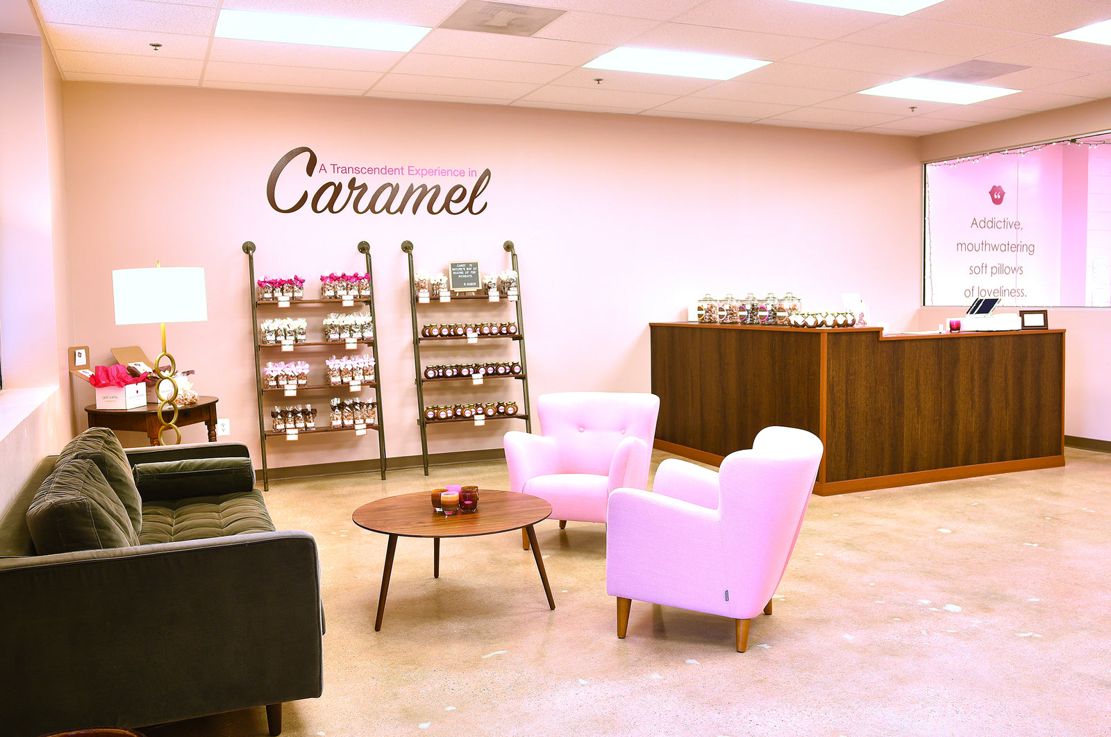 You will find our shelves stocked with gift bags, sauces, pouches, individual caramels, and merchandise items.